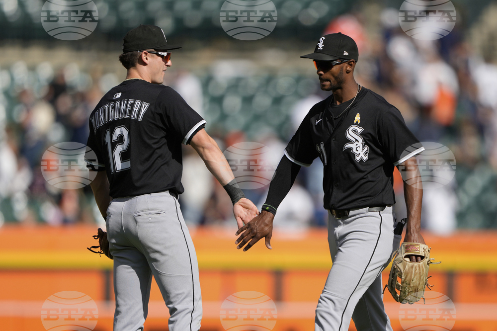 Chicago White Sox shortstop Colson Montgomery, left, and right fielder Michael A. Taylor, right, celebrate after a baseball game against the Detroit Tigers, Sunday, Sept. 7, 2025, in Detroit. (AP Photo/Ryan Sun)