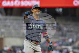Seattle Mariners outfielder Julio Rodríguez (44) celebrates after a home run during the seventh inning of a baseball game against the Atlanta Braves Saturday, Sept. 6, 2025, in Atlanta. (AP Photo/Erik Rank)
