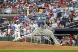 Seattle Mariners pitcher Bryce Miller (50) makes a pitch during the first inning of a baseball game against the Atlanta Braves Saturday, Sept. 6, 2025, in Atlanta. (AP Photo/Erik Rank)