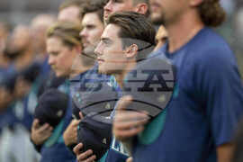 Seattle Mariners second base Cole Young (2) stands at attention for national anthem before a baseball game against the Atlanta Braves Saturday, Sept. 6, 2025, in Atlanta. (AP Photo/Erik Rank)