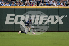 Seattle Mariners outfielder Randy Arozarena catches the ball during the first inning of a baseball game against the Atlanta Braves, Saturday, Sept. 6, 2025, in Atlanta. (AP Photo/Erik Rank)