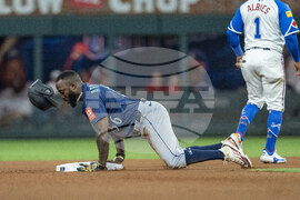 Seattle Mariners outfielder Randy Arozarena (56) slides into second base during the seventh inning of a baseball game against the Atlanta Braves, Saturday, Sept. 6, 2025, in Atlanta. (AP Photo/Erik Rank)
