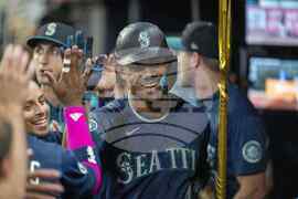 Seattle Mariners outfielder Julio Rodríguez (44) celebrates after scoring during the eighth inning of a baseball game against the Atlanta Braves Saturday, Sept. 6, 2025, in Atlanta. (AP Photo/Erik Rank)