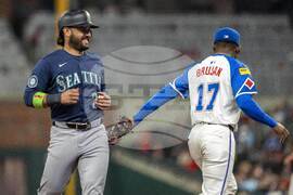 Atlanta Braves third base Vidal Bruján (17) tags Seattle Mariners third base Eugenio Suárez (28) out during the eighth inning of a baseball game Sept. 6, 2025, in Atlanta. (AP Photo/Erik Rank)