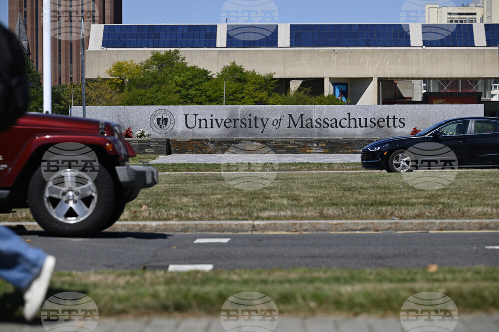 In this Sept. 3, 2025 photo, Cars pass by the University of Massachusetts, in Amherst, Mass. (AP Photo/Jessica Hill)
