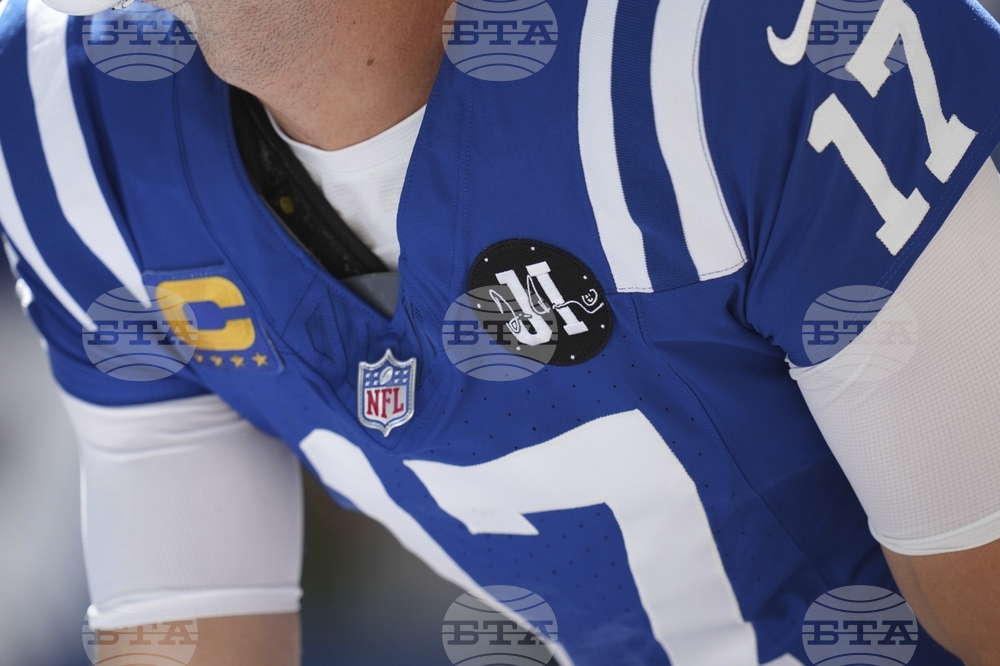 Indianapolis Colts quarterback Daniel Jones has a patch on his jersey honoring former Colts owner Jim Irsay, who died in May, before an NFL football game against the Miami Dolphins on Sunday, Sept. 7, 2025, in Indianapolis. (AP Photo/Darron Cummings)