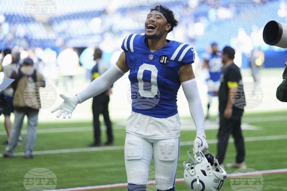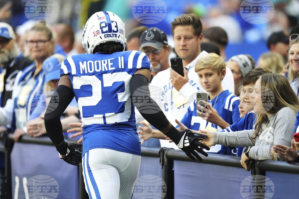 Indianapolis Colts cornerback Kenny Moore II greets fans before an NFL football game against the Miami Dolphins on Sunday, Sept. 7, 2025, in Indianapolis. (AP Photo/Darron Cummings)