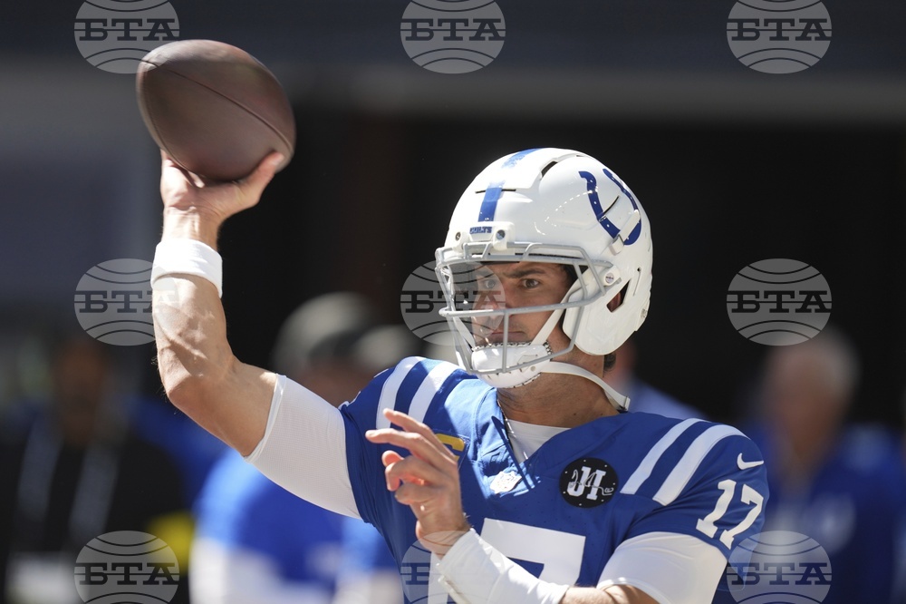 Indianapolis Colts quarterback Daniel Jones warms up before an NFL football game against the Miami Dolphins on Sunday, Sept. 7, 2025, in Indianapolis. (AP Photo/Darron Cummings)