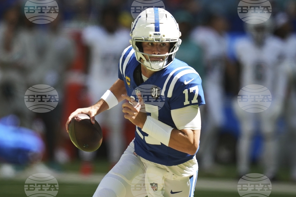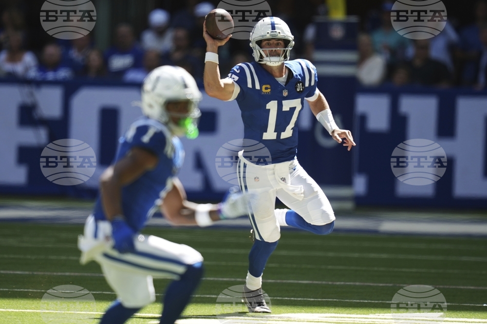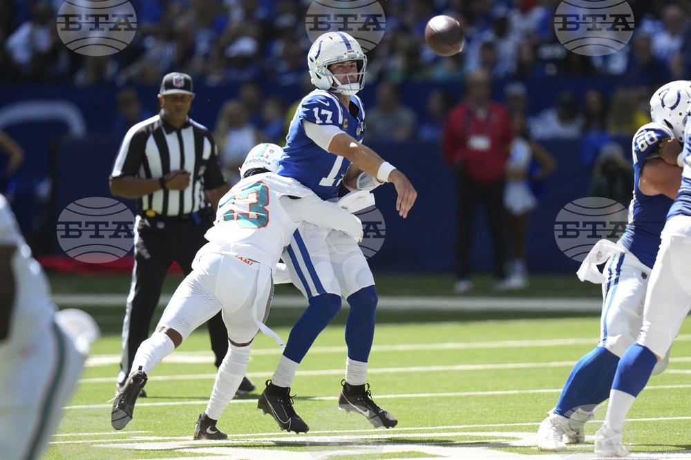 Indianapolis Colts quarterback Daniel Jones looks to pass during the first half of an NFL football game against the Miami Dolphins on Sunday, Sept. 7, 2025, in Indianapolis. (AP Photo/AJ Mast)
