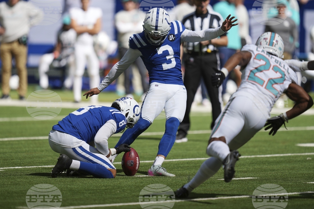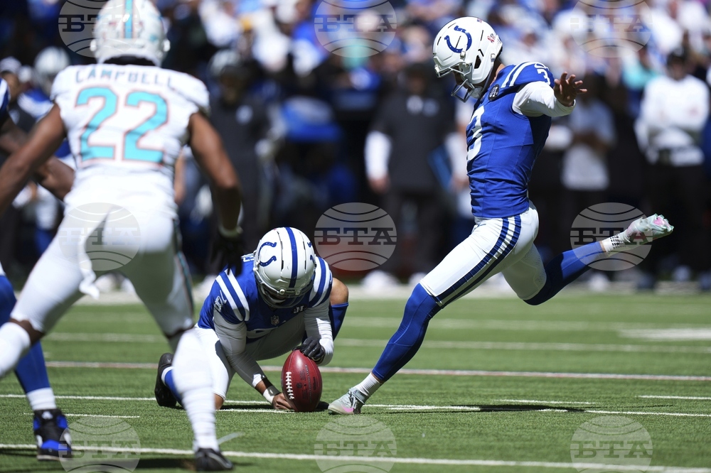 Indianapolis Colts' Spencer Shrader (3) kicks a field goal during the first half of an NFL football game against the Miami Dolphins on Sunday, Sept. 7, 2025, in Indianapolis. (AP Photo/AJ Mast)