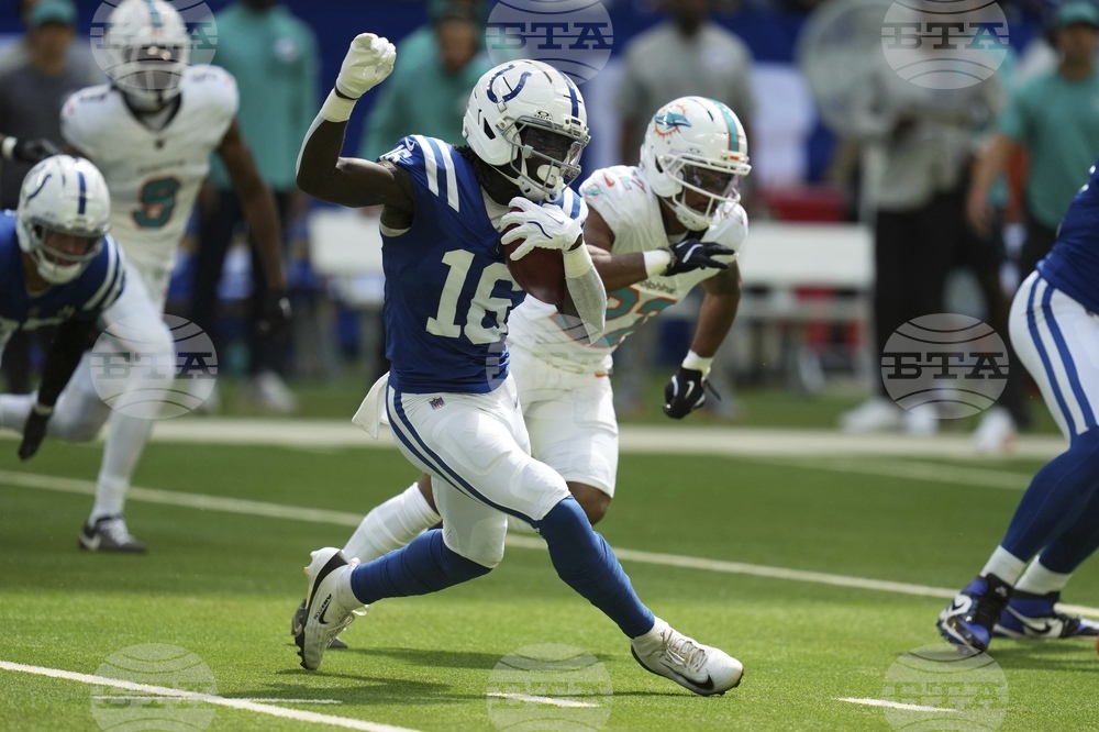 Indianapolis Colts wide receiver Ashton Dulin (16) runs with the ball during the first half of an NFL football game against the Miami Dolphins on Sunday, Sept. 7, 2025, in Indianapolis. (AP Photo/Darron Cummings)