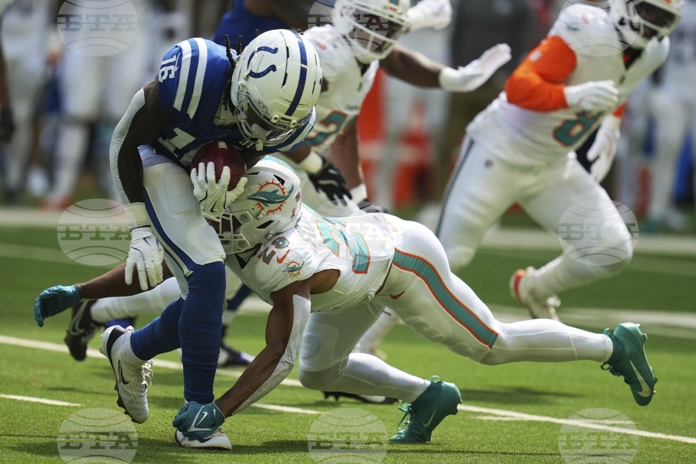 Indianapolis Colts wide receiver Michael Pittman Jr. (11) is tackled by Miami Dolphins safety Minkah Fitzpatrick (29) during the second half of an NFL football game Sunday, Sept. 7, 2025, in Indianapolis. (AP Photo/Darron Cummings)