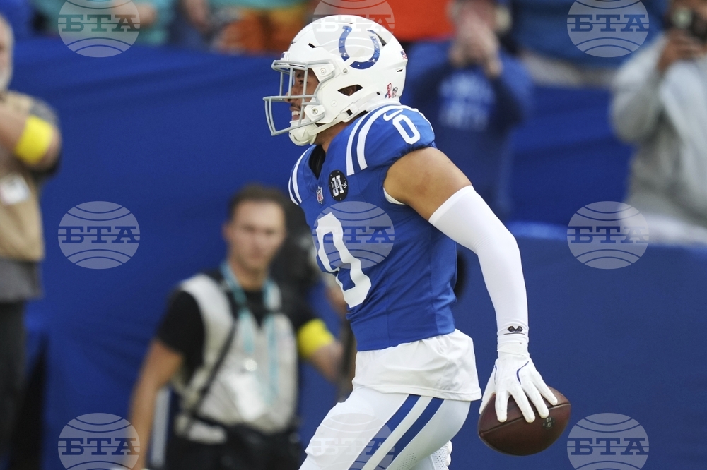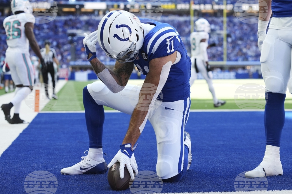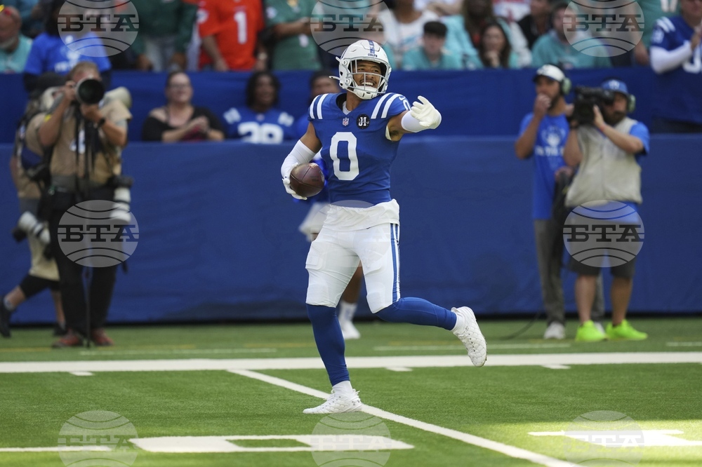 Indianapolis Colts wide receiver Michael Pittman Jr. (11) celebrates scoring a touchdown during the first half of an NFL football game against the Miami Dolphins on Sunday, Sept. 7, 2025, in Indianapolis. (AP Photo/AJ Mast)