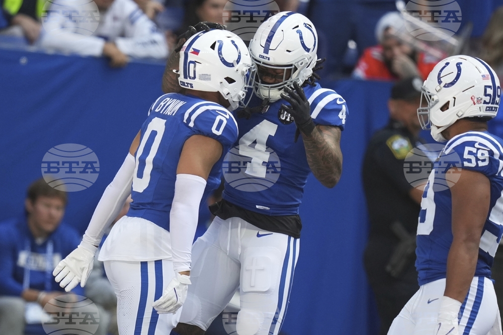 Indianapolis Colts wide receiver Michael Pittman Jr. (11) celebrates scoring a touchdown with teammates during the first half of an NFL football game against the Miami Dolphins on Sunday, Sept. 7, 2025, in Indianapolis. (AP Photo/AJ Mast)