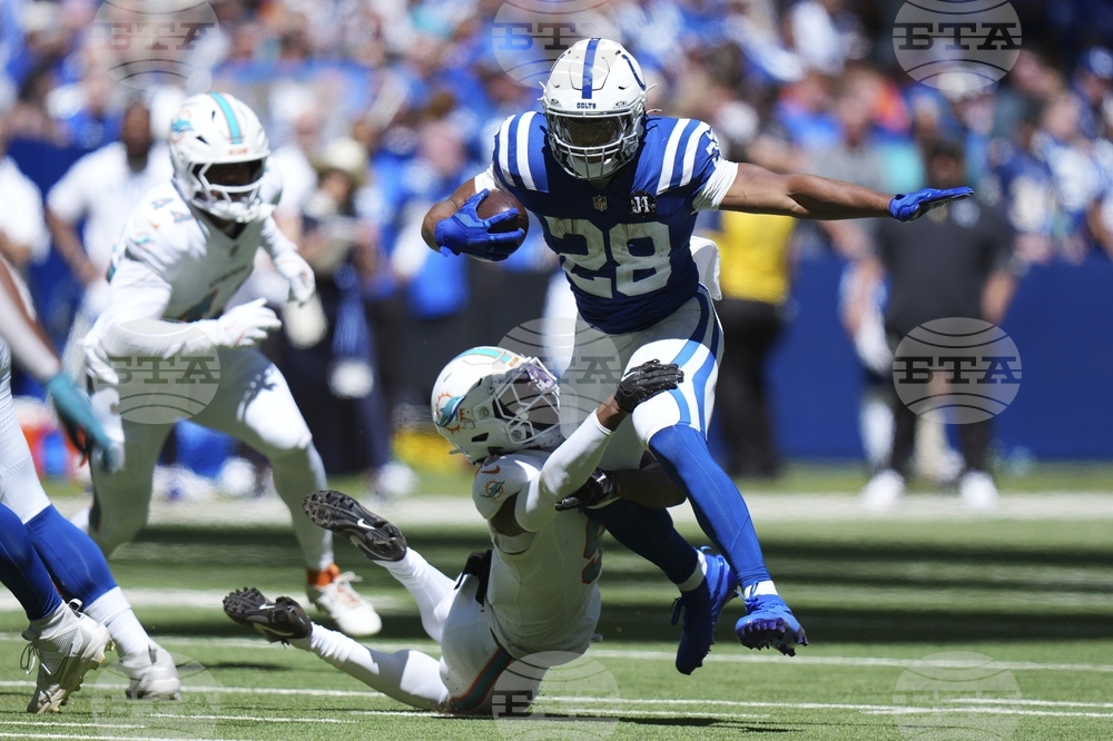 Indianapolis Colts running back Jonathan Taylor (28) is tackled by Miami Dolphins safety Ifeatu Melifonwu (9) during the first half of an NFL football game Sunday, Sept. 7, 2025, in Indianapolis. (AP Photo/AJ Mast)