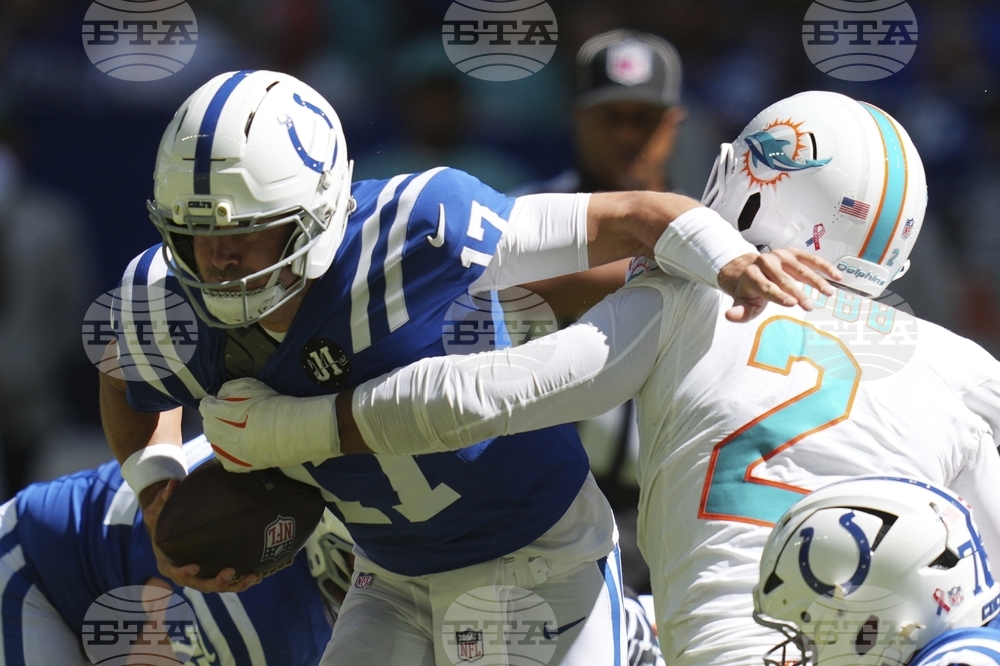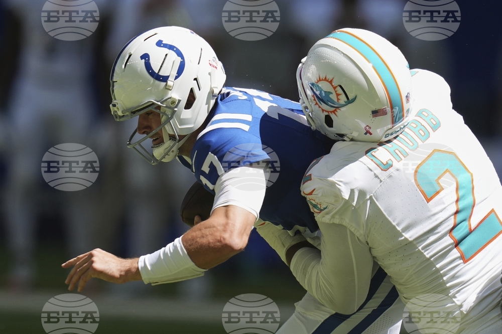 Indianapolis Colts quarterback Daniel Jones (17) is stacked by Miami Dolphins linebacker Bradley Chubb (2) during the first half of an NFL football game Sunday, Sept. 7, 2025, in Indianapolis. (AP Photo/Darron Cummings)