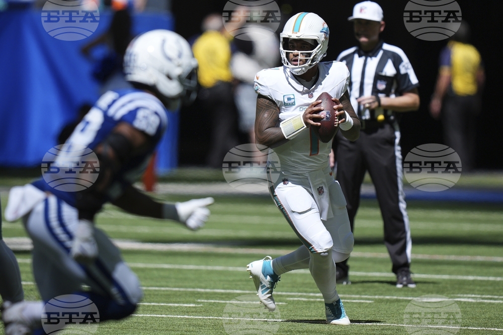 Miami Dolphins quarterback Tua Tagovailoa (1) looks to pass during the first half of an NFL football game against the Indianapolis Colts on Sunday, Sept. 7, 2025, in Indianapolis. (AP Photo/AJ Mast)