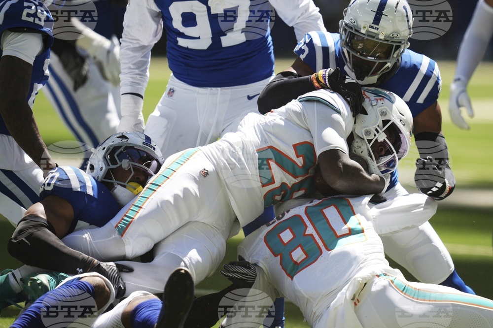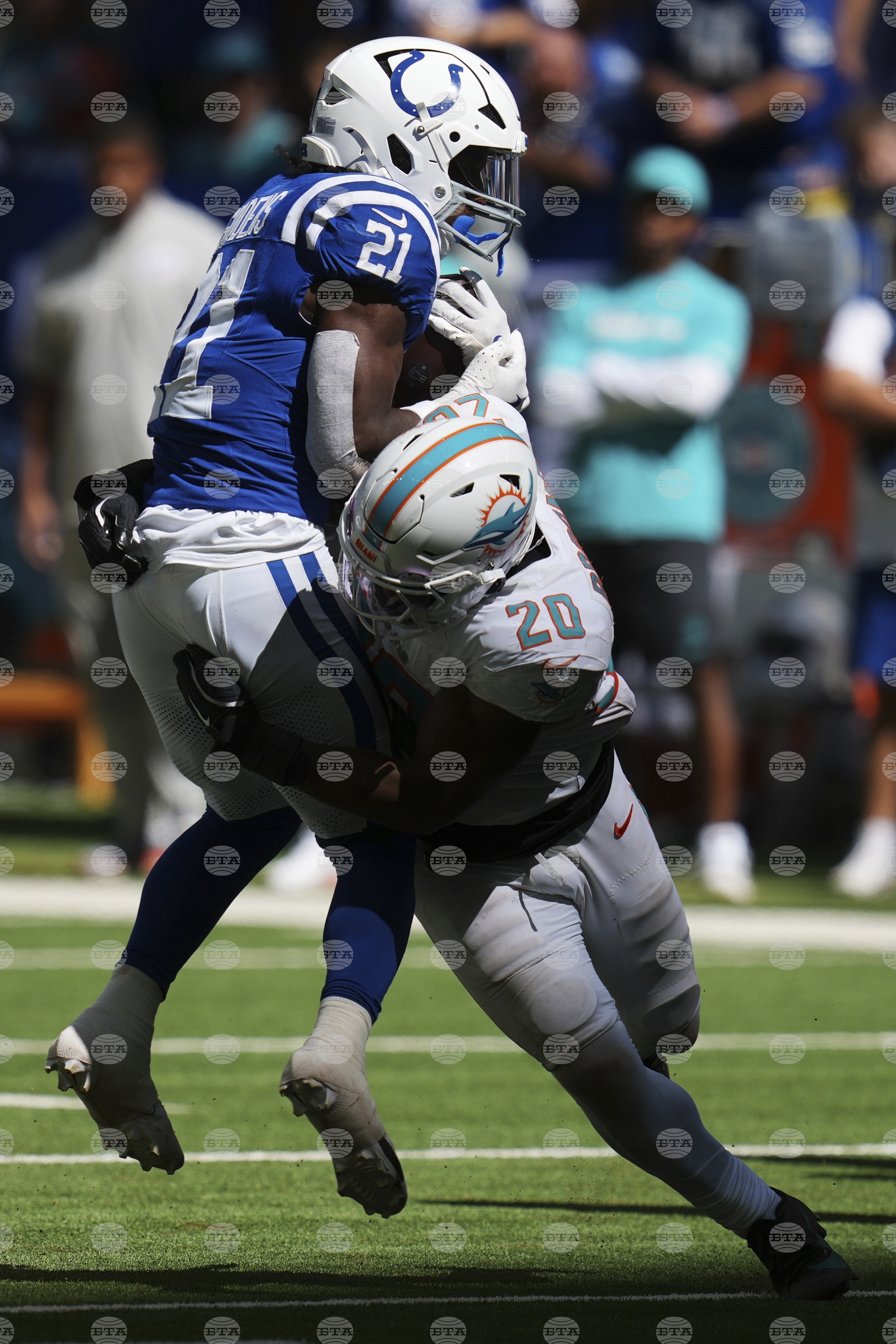 Indianapolis Colts running back DJ Giddens (21) is tackled by Miami Dolphins linebacker Jordyn Brooks (20) during the second half of an NFL football game Sunday, Sept. 7, 2025, in Indianapolis. (AP Photo/Darron Cummings)