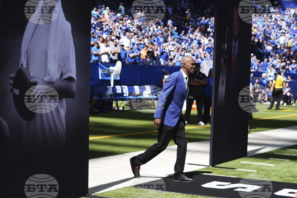 Former Indianapolis Colts player Marvin Harrison Sr. walks onto the field during halftime of an NFL football game against the Miami Dolphins on Sunday, Sept. 7, 2025, in Indianapolis. (AP Photo/Darron Cummings)