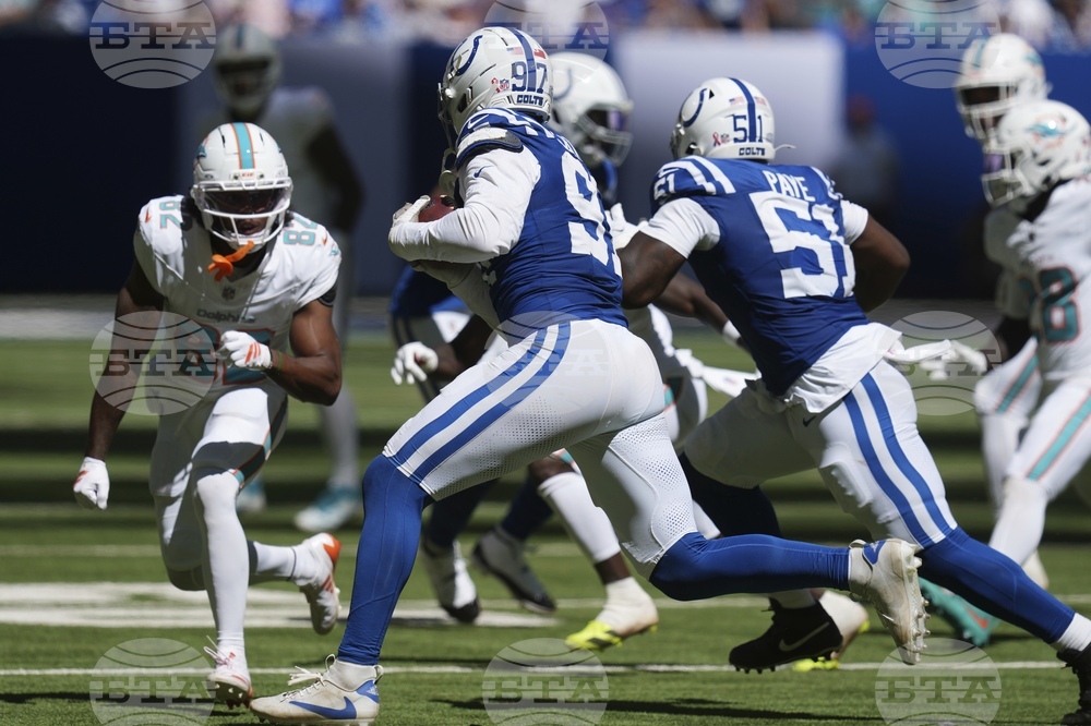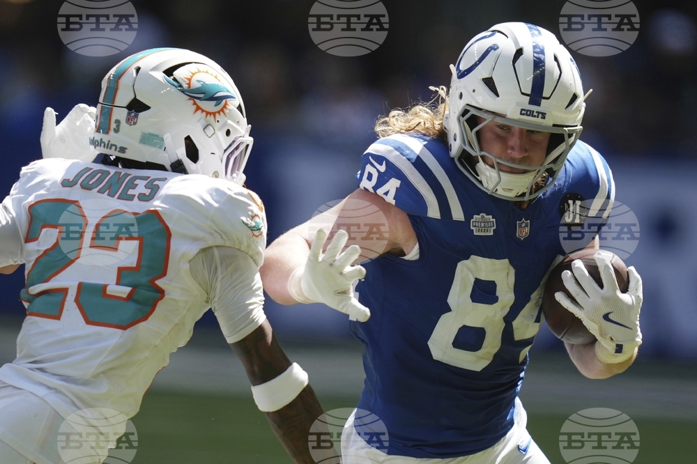Indianapolis Colts tight end Tyler Warren (84) runs past Miami Dolphins safety Dante Trader Jr. (25) during the second half of an NFL football game Sunday, Sept. 7, 2025, in Indianapolis. (AP Photo/AJ Mast)