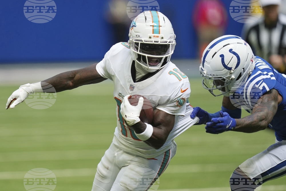 Miami Dolphins wide receiver Tyreek Hill (10) is tackled by Indianapolis Colts cornerback Charvarius Ward (7) during the second half of an NFL football game Sunday, Sept. 7, 2025, in Indianapolis. (AP Photo/Darron Cummings)