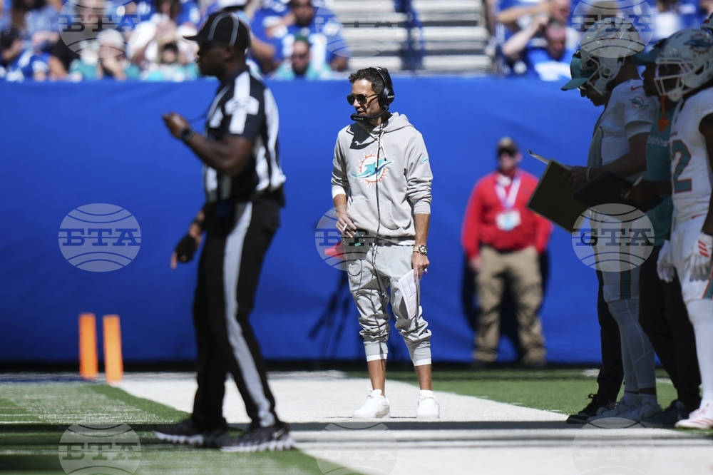 Miami Dolphins head coach Mike McDaniel watches action during the second half of an NFL football game against the Indianapolis Colts on Sunday, Sept. 7, 2025, in Indianapolis. (AP Photo/AJ Mast)