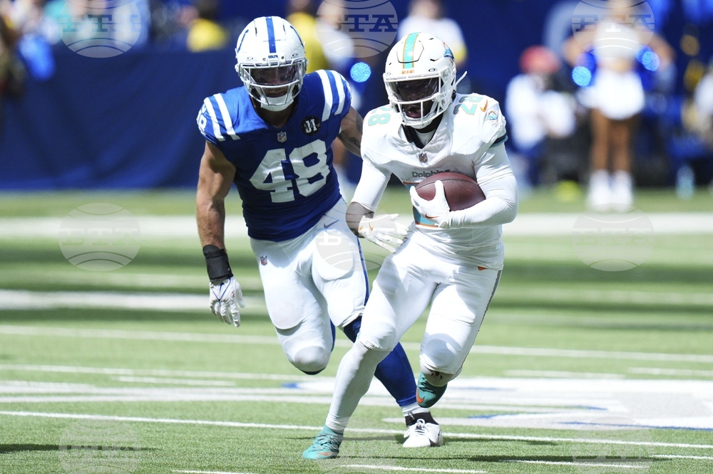 Miami Dolphins' De'Von Achane (28) runs with the ball under pressure from Indianapolis Colts linebacker Joe Bachie (48) during the second half of an NFL football game Sunday, Sept. 7, 2025, in Indianapolis.(AP Photo/AJ Mast)