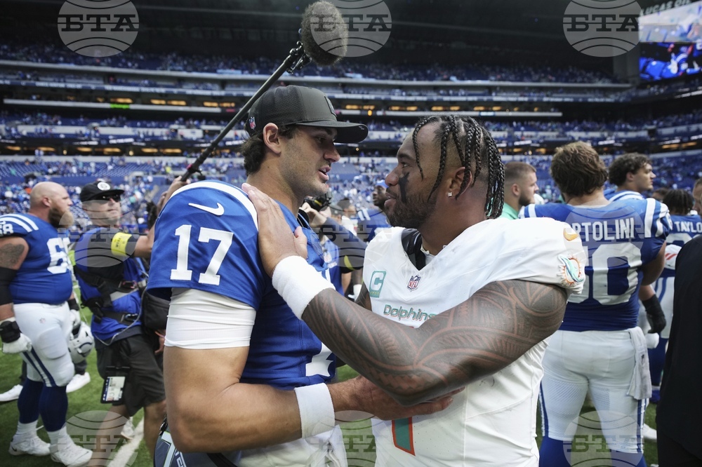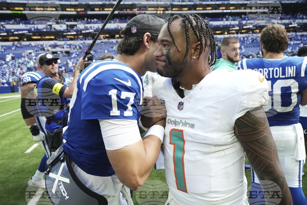 Miami Dolphins quarterback Tua Tagovailoa (1) and Indianapolis Colts quarterback Daniel Jones (17) meet after an NFL football game Sunday, Sept. 7, 2025, in Indianapolis. (AP Photo/AJ Mast)