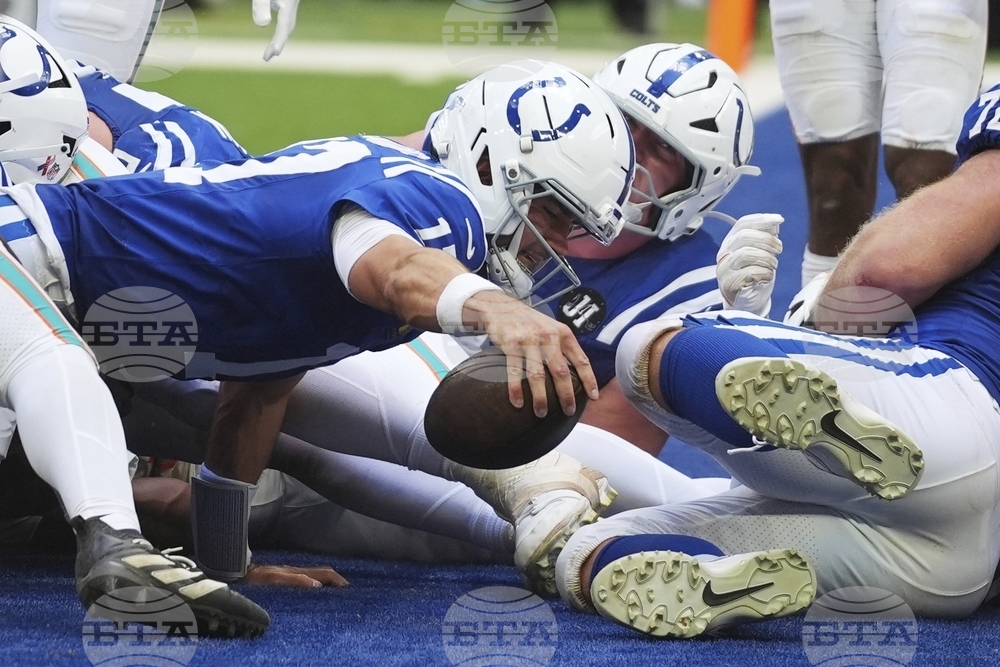 Indianapolis Colts quarterback Daniel Jones (17) scores a touchdown during the second half of an NFL football game against the Miami Dolphins on Sunday, Sept. 7, 2025, in Indianapolis. (AP Photo/Darron Cummings)