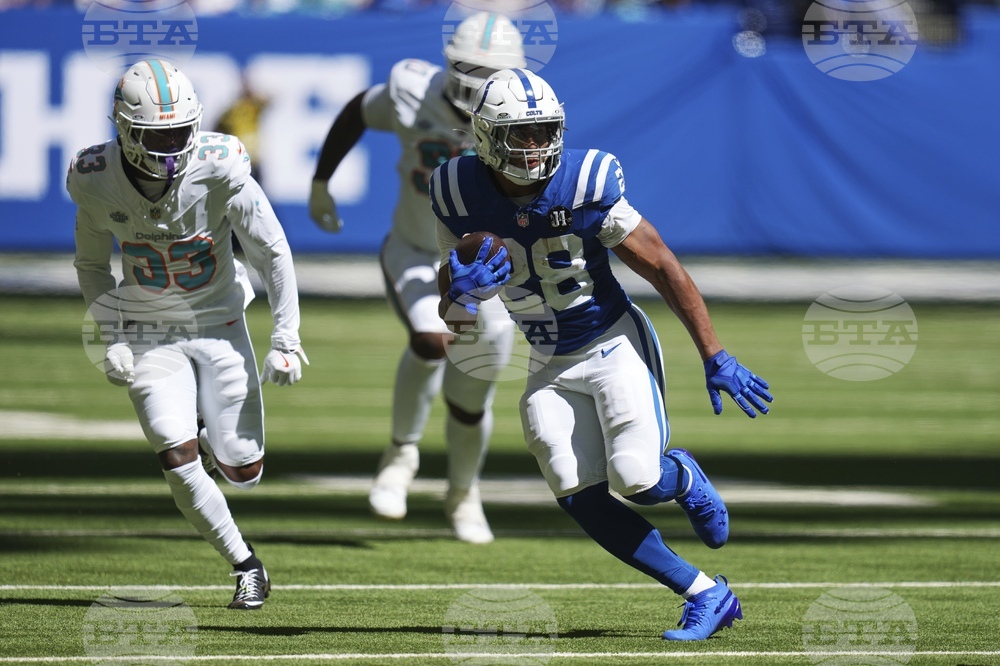 Indianapolis Colts running back Jonathan Taylor (28) runs with the ball during the first half of an NFL football game as Miami Dolphins cornerback Jason Marshall Jr. (33) trails Sunday, Sept. 7, 2025, in Indianapolis. (AP Photo/Darron Cummings)