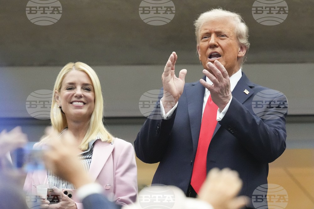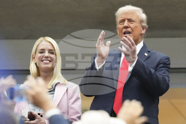 President Donald Trump, right, Steve Witkoff, center, and U.S. Attorney General, Pam Bondi, watch play between Carlos Alcaraz, of Spain, and Jannik Sinner, of Italy, during the men's singles final of the U.S. Open tennis championships, Sunday, Sept. 7, 2025, in New York. (AP Photo/Yuki Iwamura)
