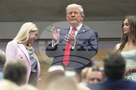 President Donald Trump attends the men's singles final of the U.S. Open tennis championships, Sunday, Sept. 7, 2025, in New York. (AP Photo/Frank Franklin)