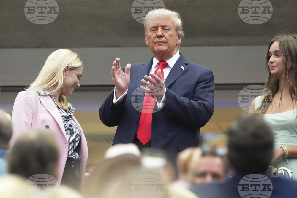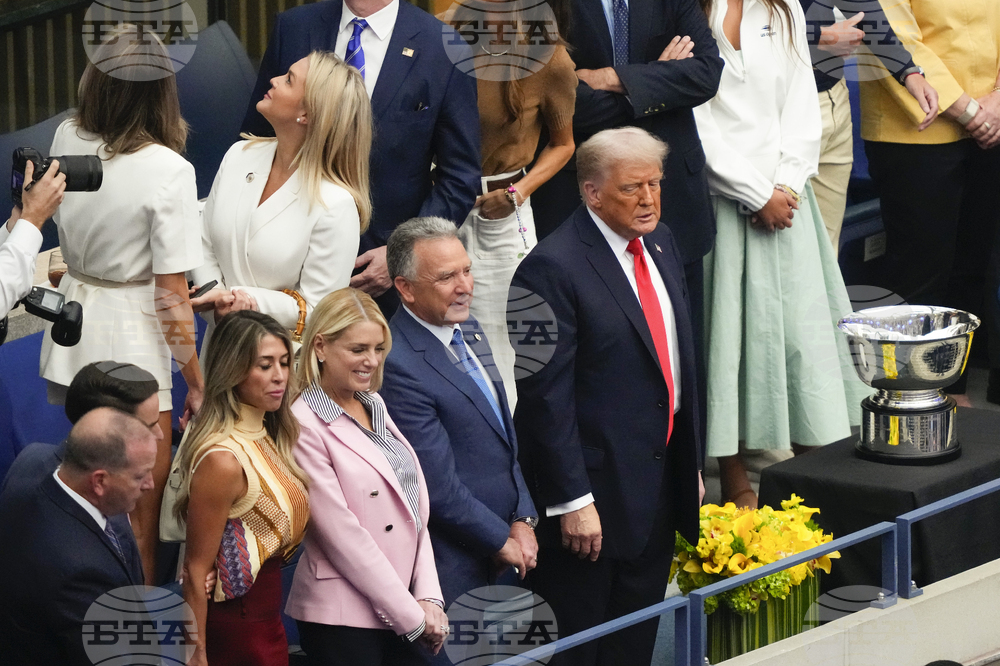 President Donald Trump waves to spectators while accompanied by U.S. Attorney General, Pam Bondi, left, Arabella Kushner third from left, Jared Kushner, second from right, and Susie Wiles, White House Chief of Staff, during the men's singles final of the U.S. Open tennis championships, Sunday, Sept. 7, 2025, in New York. (AP Photo/Yuki Iwamura)
