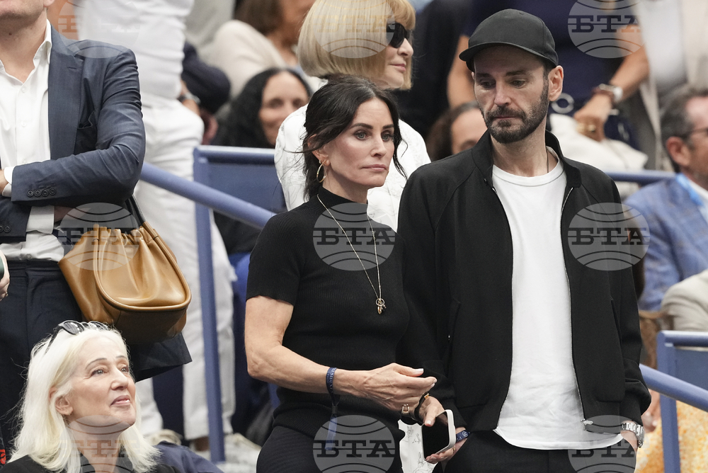 Johnny McDaid and Courtney Cox, wait for the start of the men's singles final of the U.S. Open tennis championships, Sunday, Sept. 7, 2025, in New York. (AP Photo/Kirsty Wigglesworth)