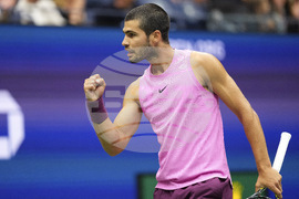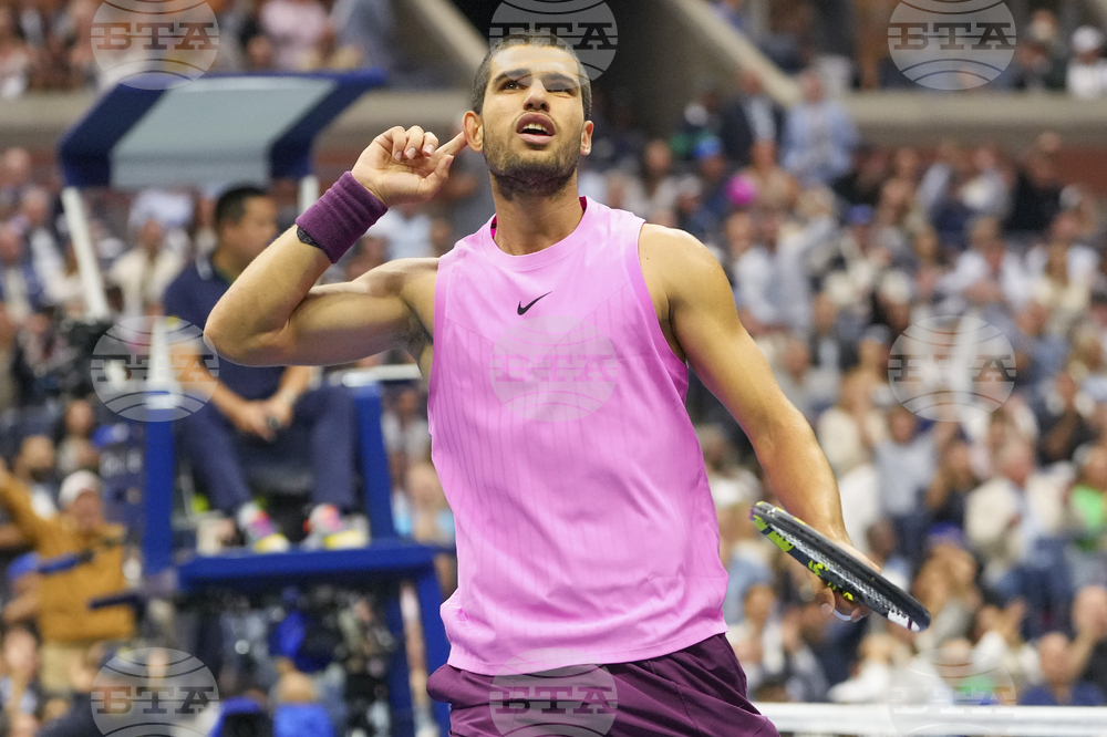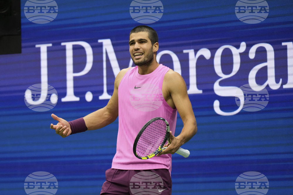 Carlos Alcaraz, of Spain, reacts during the men's singles final of the U.S. Open tennis championships against Jannik Sinner, of Italy, Sunday, Sept. 7, 2025, in New York. (AP Photo/Seth Wenig)