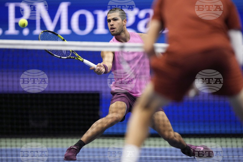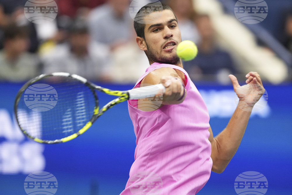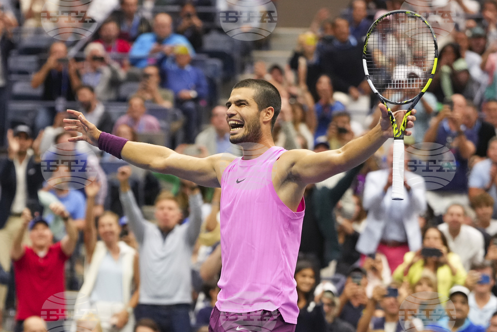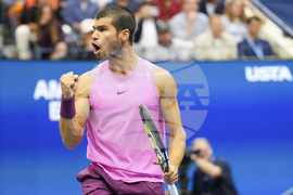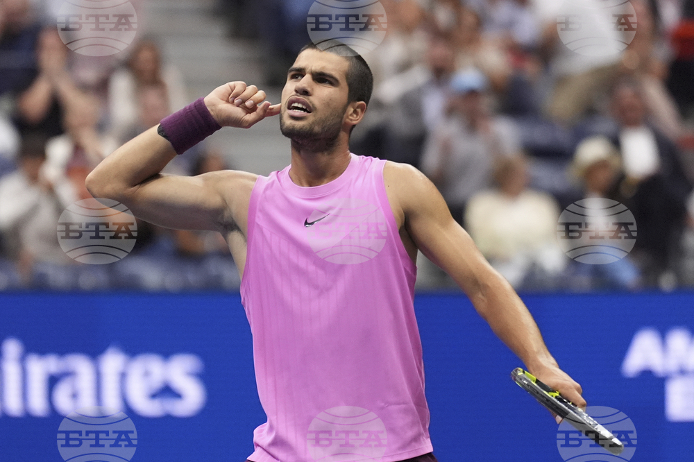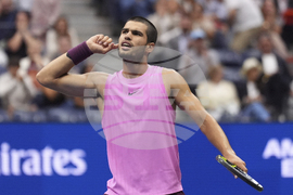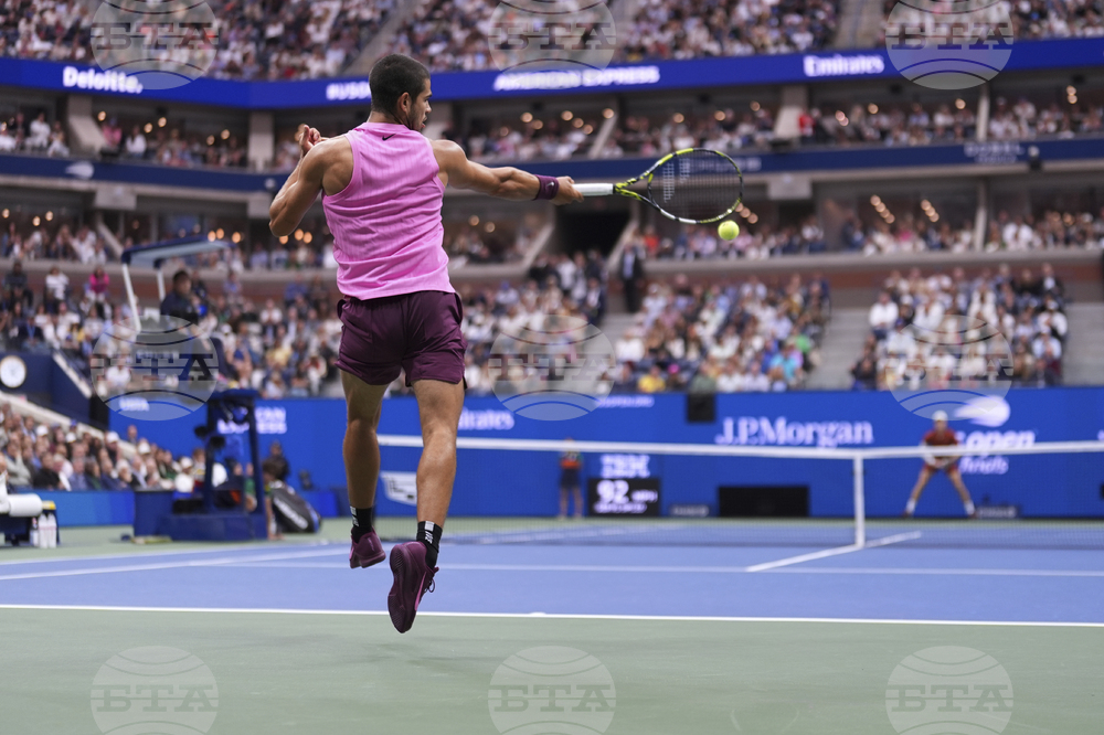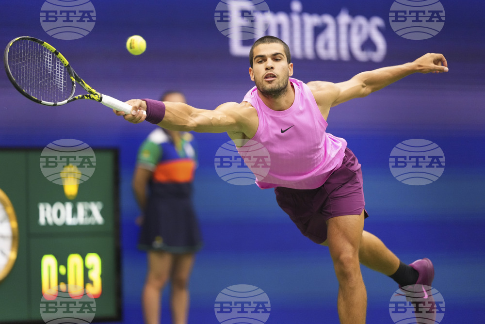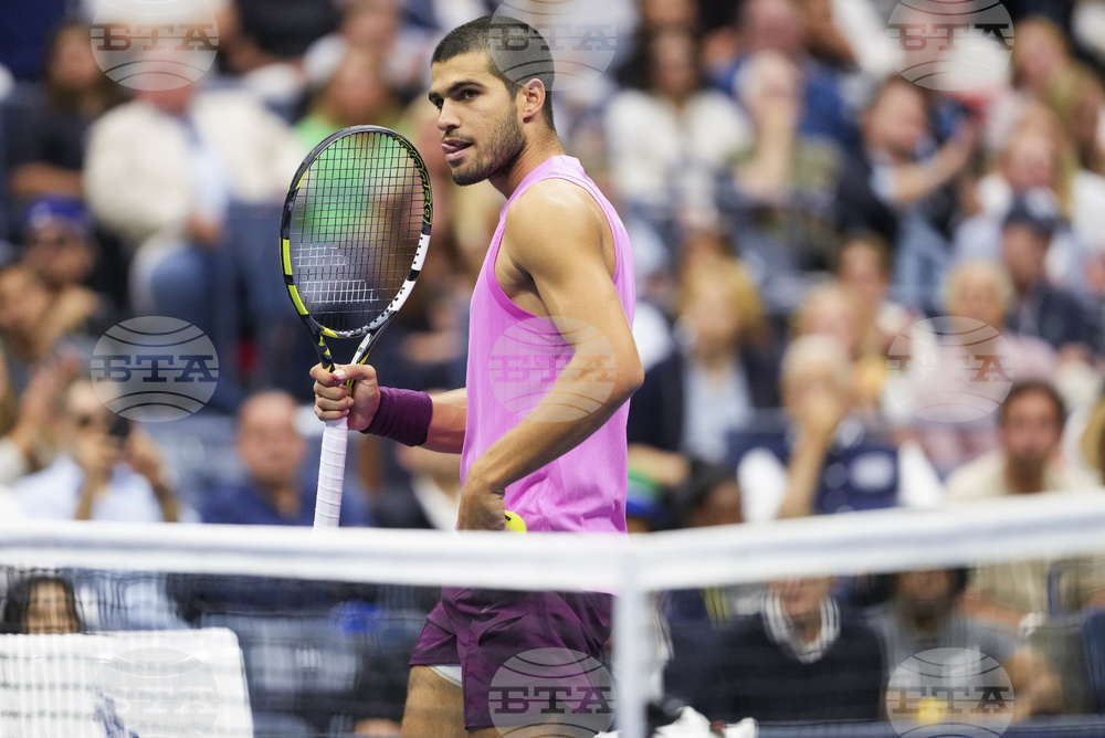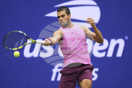 Carlos Alcaraz, of Spain, returns a shot against Jannik Sinner, of Italy, during the men¥s singles final of the U.S. Open tennis championships, Sunday, Sept. 7, 2025, in New York. (AP Photo/Frank Franklin)