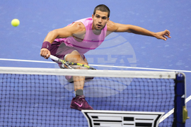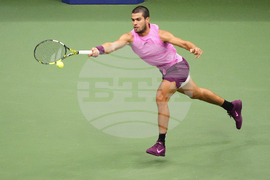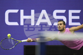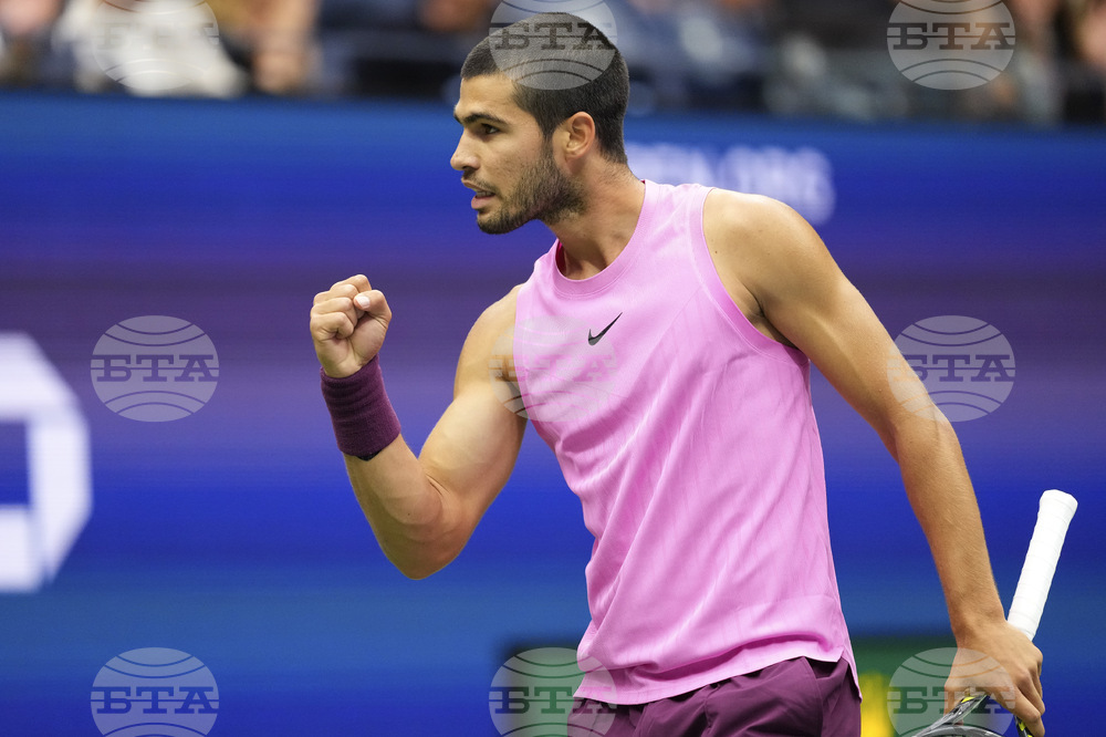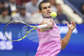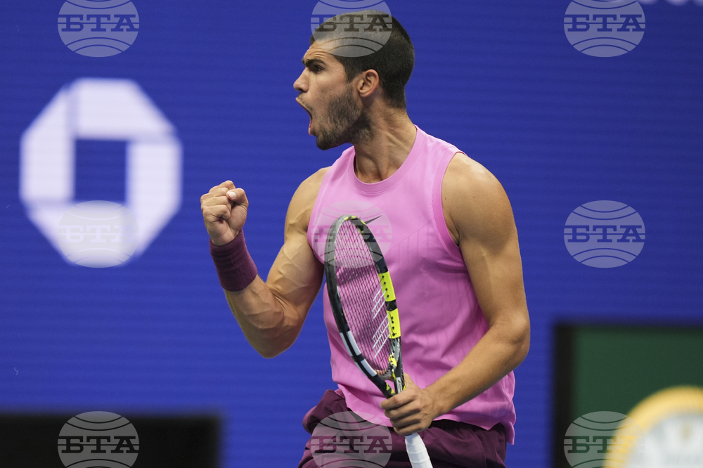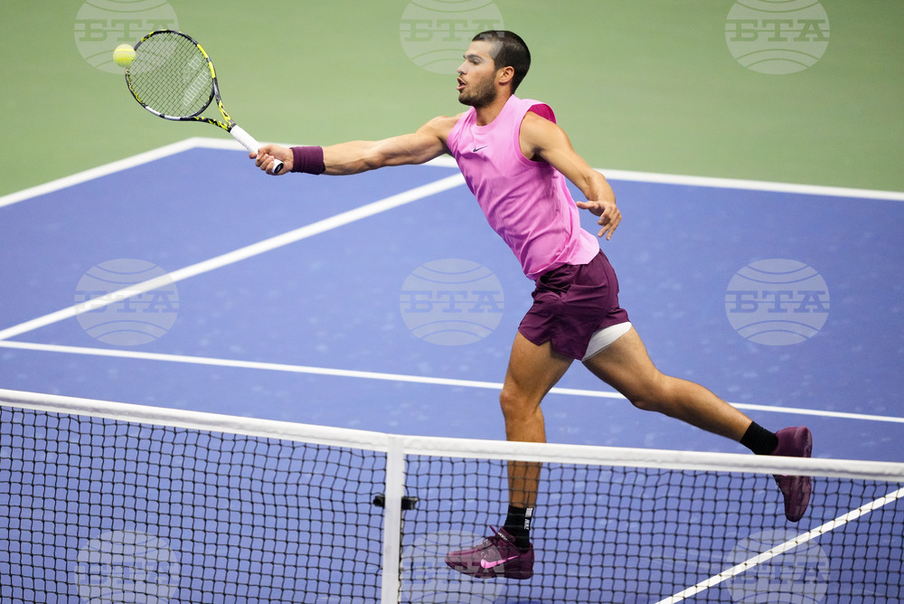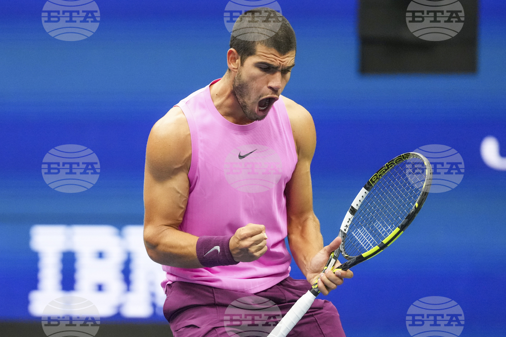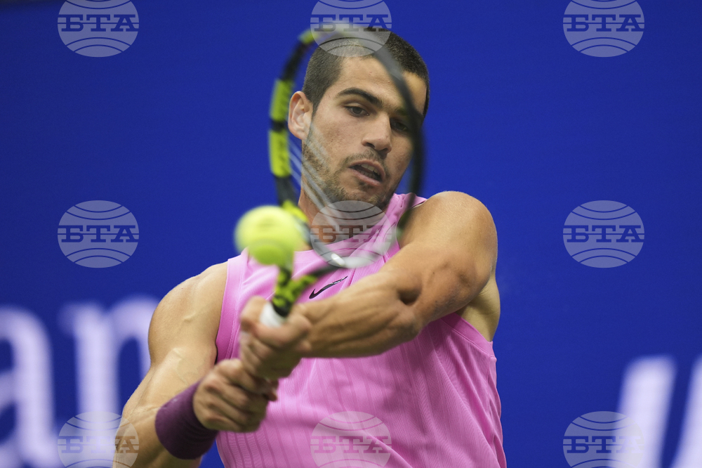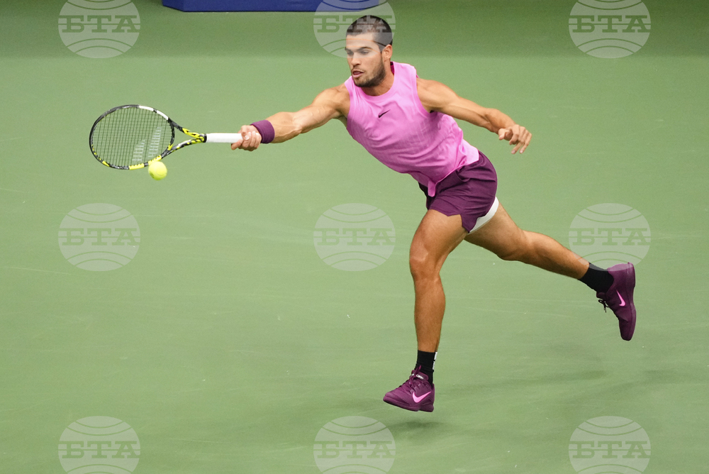 Carlos Alcaraz, of Spain, returns a shot against Jannik Sinner, of Italy, during the men¥s singles final of the U.S. Open tennis championships, Sunday, Sept. 7, 2025, in New York. (AP Photo/Frank Franklin)