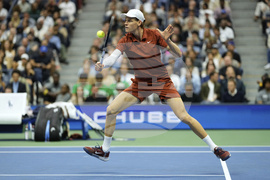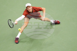 Jannik Sinner, of Italy, returns a shot to Carlos Alcaraz, of Spain, during the men's singles final of the U.S. Open tennis championships, Sunday, Sept. 7, 2025, in New York. (AP Photo/Yuki Iwamura)