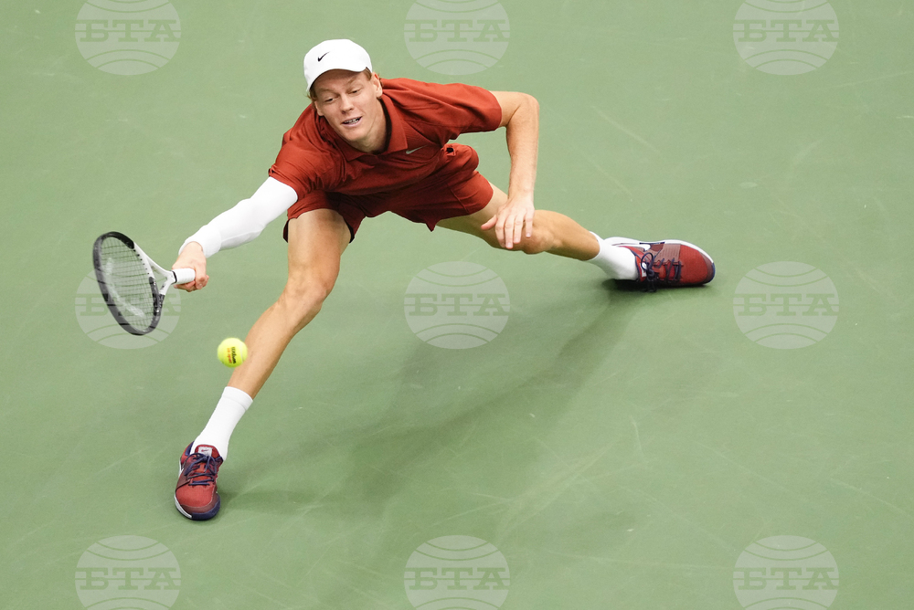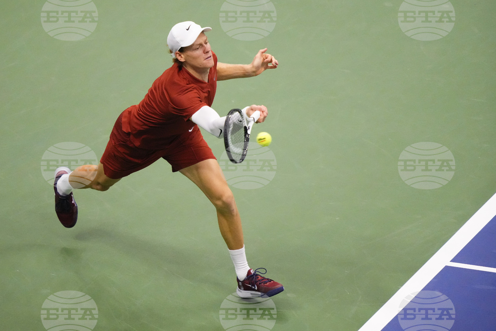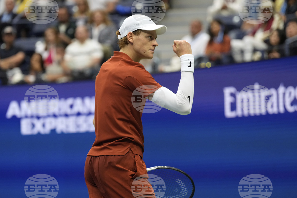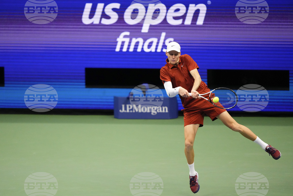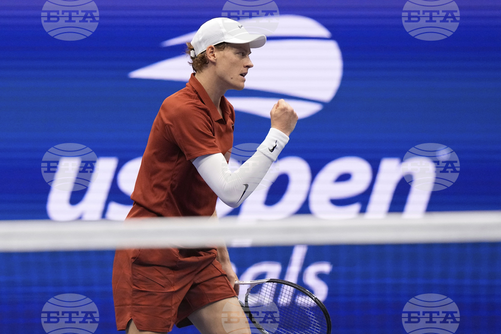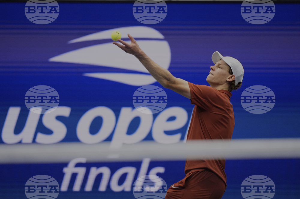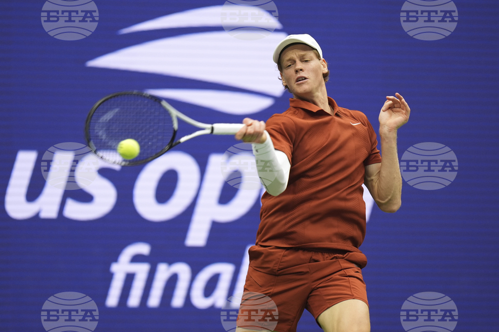 Jannik Sinner, of Italy, returns a shot against Carlos Alcaraz, of Spain, during the men's singles final of the U.S. Open tennis championships, Sunday, Sept. 7, 2025, in New York. (AP Photo/Seth Wenig)
