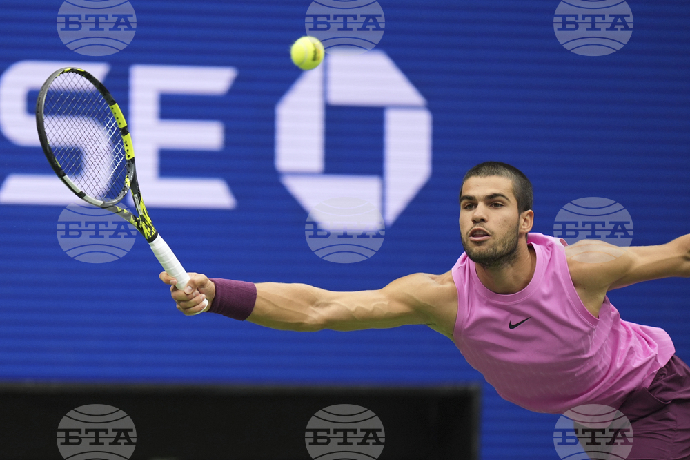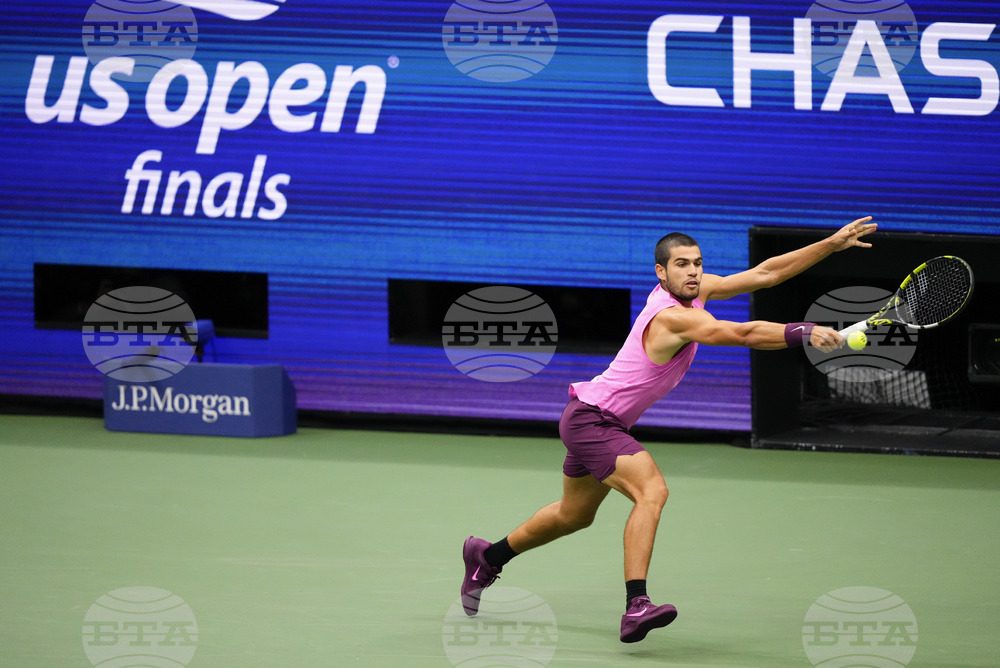 Carlos Alcaraz, of Spain, reaches to return a shot against Jannik Sinner, of Italy, during the men's singles final of the U.S. Open tennis championships, Sunday, Sept. 7, 2025, in New York. (AP Photo/Frank Franklin II)