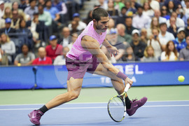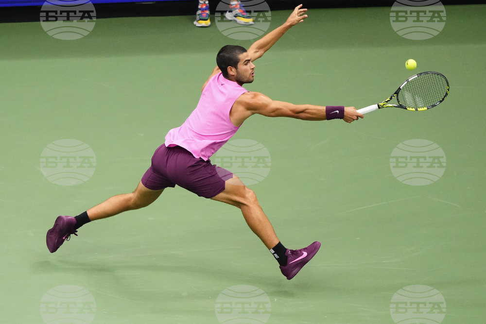 Carlos Alcaraz, of Spain, stretches to returns a shot against Jannik Sinner, of Italy, during the men's singles final of the U.S. Open tennis championships, Sunday, Sept. 7, 2025, in New York. (AP Photo/Seth Wenig)
