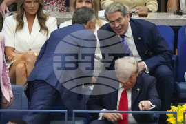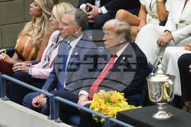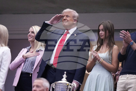 President Donald Trump attends the men's singles final of the U.S. Open tennis championships between Jannik Sinner, of Italy, and Carlos Alcaraz, of Spain, Sunday, Sept. 7, 2025, in New York. (AP Photo/Seth Wenig)