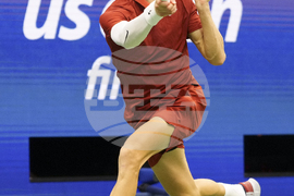 Carlos Alcaraz, of Spain, returns a shot to Jannik Sinner, of Italy, during the men's singles final of the U.S. Open tennis championships, Sunday, Sept. 7, 2025, in New York. (AP Photo/Yuki Iwamura)