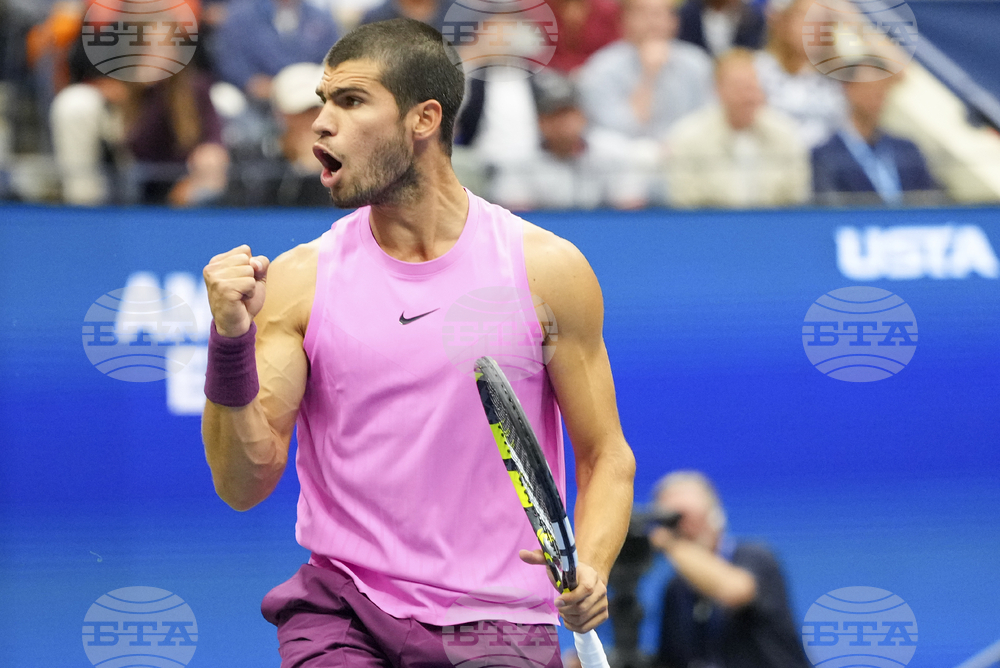 Carlos Alcaraz, of Spain, reacts after scoring a point against Jannik Sinner, of Italy, during the men's singles final of the U.S. Open tennis championships, Sunday, Sept. 7, 2025, in New York. (AP Photo/Kirsty Wigglesworth)