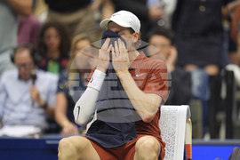 Jannik Sinner, of Italy, sits between sets during the men's singles final of the U.S. Open tennis championships against Carlos Alcaraz, of Spain, Sunday, Sept. 7, 2025, in New York. (AP Photo/Seth Wenig)