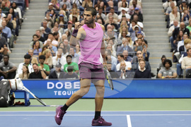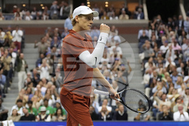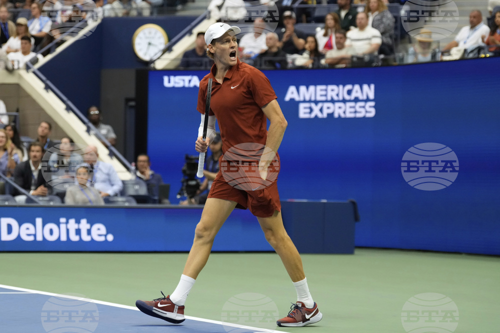 Jannik Sinner, of Italy, reacts after scoring a point against Carlos Alcaraz, of Spain, during the men's singles final of the U.S. Open tennis championships, Sunday, Sept. 7, 2025, in New York. (AP Photo/Yuki Iwamura)