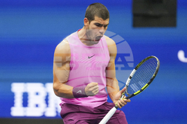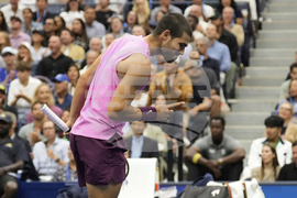 Carlos Alcaraz, of Spain, reacts during the men's singles final of the U.S. Open tennis championships against Jannik Sinner, of Italy, Sunday, Sept. 7, 2025, in New York. (AP Photo/Frank Franklin)