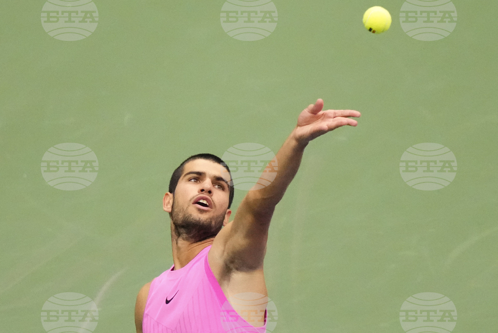 =Carlos Alcaraz, of Spain, serves to Jannik Sinner, of Italy, during the men's singles final of the U.S. Open tennis championships, Sunday, Sept. 7, 2025, in New York. (AP Photo/Yuki Iwamura)