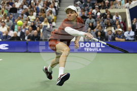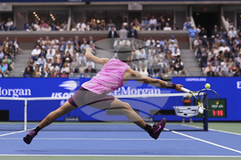 Jannik Sinner, of Italy, reaches to returns a shot against Carlos Alcaraz, of Spain, during the men's singles final of the U.S. Open tennis championships, Sunday, Sept. 7, 2025, in New York. (AP Photo/Seth Wenig)