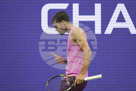 Tennis ball are delivered to Jannik Sinner, of Italy, during the men's singles final of the U.S. Open tennis championships against Carlos Alcaraz, of Spain,, Sunday, Sept. 7, 2025, in New York. (AP Photo/Frank Franklin)